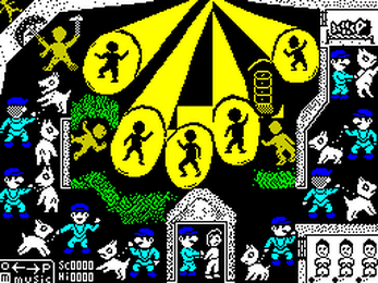 Technique uses LPrint on attribute zone to rapidly change colors on the screen. The bitmap remains unaltered all the time. The code has only one Print instruction, used to update the score.